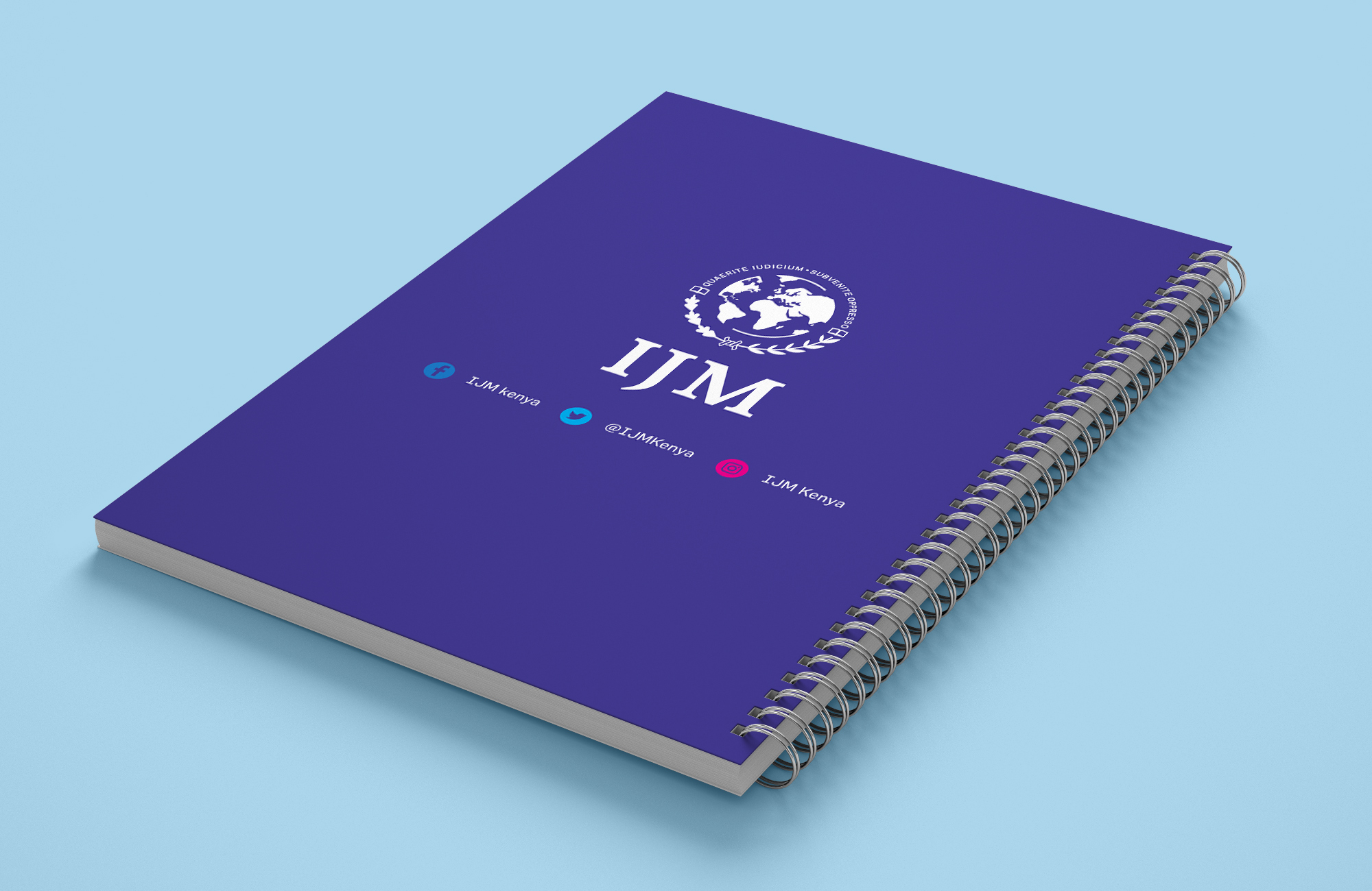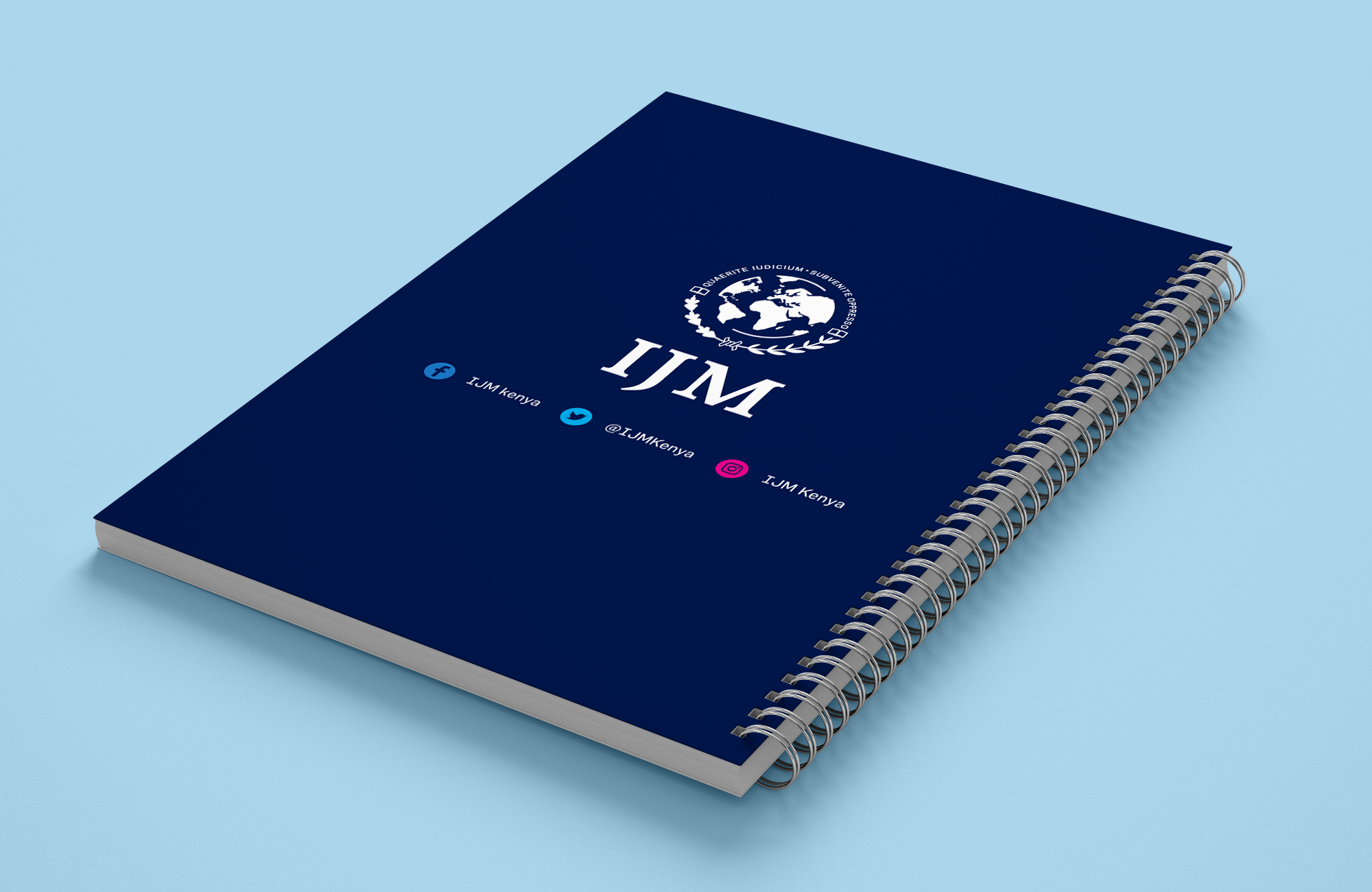 To design a professional and branded notebook for IJM Kenya that aligns with their organizational identity.